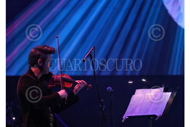 GUANAJUATO, GUANAJUATO, 24OCTUBRE2021. - La orquesta Cámara Higinio Ruvalcaba y Bruno Axel, director y violinista, durante concierto en la Alhóndiga de Granaditas como parte de la cartelera musical del Festival Internacional Cervantino 2021. En esta función se escucho la música de Antonio Vivaldi. La obra original conocida popularmente como Las cuatro estaciones, creada entre 1723 y 1725, habita aquí entre sintetizadores, un bajo con pedaleas de efectos, la percusión acústica y electrónica, la voz tratada, samplers electrónicos y la magia visual de una video DJ. FOTO: ANDREA MURCIA /CUARTOSCURO.COM