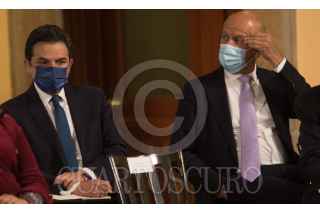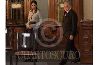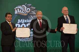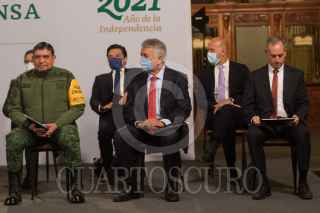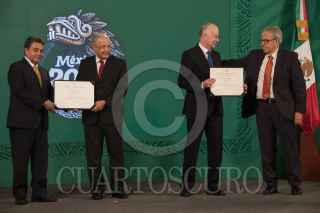 CIUDAD DE MÉXICO, 26OCTUBRE2021.- Andrés Manuel López Obrador, Presidente de México, encabezó la conferencia matutina en Palacio Nacional, y como cada martes se presentó el "Pulso de la Salud". Lo acompañaron Jorge Alcocer, secretario de Salud; Delfina Gómez, titular de la SEP; Luis Cresencio Sandoval, titular de la SEDENA; Hugo López-Gatell, subsecretario de Salud entre otros. Se entregó a los médicos Jorge Salas y Manuel Martinez un premio al mérito por sus investigaciones y trayectoria. FOTO: VICTORIA VALTIERRA/CUARTOSCURO.COM
