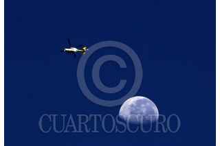 CUERNAVACA, MORELOS, 26OCTUBRE2021.- Vida cotidiana en la capital de Morelos, un helicóptero surca el cielo, detrás la luna en su fase menguante. FOTO: MARGARITO PÉREZ RETANA/CUARTOSCURO.COM