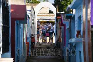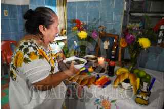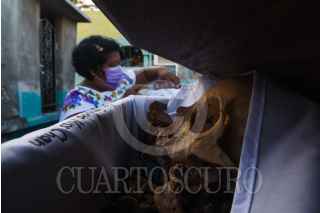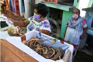 HECELCHAKAN, CAMPECHE, 26OCTUBRE2021.- En el Poblado de Pomuch del municipio de Hecelchakan en Campeche, como cada año la tradición milenaria que da vida a la muerte, el Choo Bá ak o limpieza de huesos se mantiene viva a pesar de la pandemia del Covid-19, un ritual maya único en México que representa una conexión entre vivos y muertos previo al Hanal Pixan. Para Dulce María Cohuo Pech de 79 años de edad y quien mantiene arraigada la tradición por generación, el día de muertos representa mantener un vínculo con sus familiares, y prepararse para la llegada de las ánimas. Ella tuvo que esperar un año para poder acudir al cementerio, debido a la pandemia del Covid-19 que hizo que pausara su visita el año pasado al lugar por miedo al contagio. Hoy a pesar de que la pandemia continua, tiene mayor seguridad con su esquema completo de vacunación, por lo que regreso a su tradición de ir al camposanto acompañada de sus nietas y su hija María Ehuan Cohuo quien es la encargada de realizar la limpieza de huesos. En el lugar, Doña Dulce observa mientras su hija quien también ha adoptado la tradición realiza la limpieza de hueso de cinco familiares, momento en que les quita el polvo y cambia de manta para ser vueltos a colocar en su respectiva caja, con esto estarán limpios a la hora de su llegada. Un momento íntimo entre los familiares y los difuntos. A pesar de su edad doña Dulce cumple con la tradición preparando su altar para la llegada de los fieles difuntos, explica que las flores significa la presencia de María, la luz de la veladora la presencia de Jesús, y el agua nos recuerda que fuimos bautizados; en el altar no puede faltar la comida y el rezo para esperar a que las ánimas vengan a recoger la gracia. FOTO: MICHAEL BALAM/CUARTOSCURO.COM