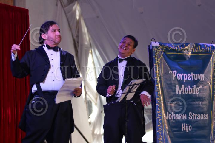 GUANAJUATO, GUANAJUATO, 28OCTUBRE2021.- El duo de IMAGINARE-Art y Compañía de Teatro Columna Cuatro con su obra Desconcierto a cuatro mano a cargo de la dirección de Gabriel Neaves y Francisco Ramírez se presentaron en la Ex Hacienda San Gabriel de Barrera como parte de la cartelera del Festival Internacional Cervantino invitado de honor Coahuila. Una obra alegre y divertida creada por Gabriel Neaves y Francisco Ramírez para acercar a niños y niñas a la música clásica a través de carcajadas y buen humor. Neaves y Ramírez interpretan a dos directores de orquesta quienes son llamados a trabajar en un recital el mismo día, a la misma hora y en el mismo lugar. Ambos se disputan el atril y las partituras, propician un duelo de dirección orquestal que los hace probar sus capacidades y conocimientos en la música de grandes compositores como Vivaldi, Haydn, Beethoven, Tchaikovsky y Mozart, entre otros. FOTO: ANDREA MURCIA /CUARTOSCURO.COM