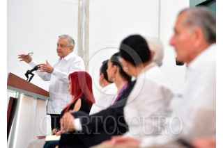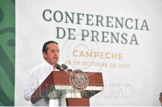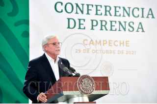 CAMPECHE, CAMPECHE, 29OCTUBRE2021.- Andrés Manuel López Obrador, Presidente de México, encabezó la conferencia mañanera en la Tercera Región Naval. Lo acompañaron Hugo López-Gatell, subsecretario de Salud; Rosa Icela Rodríguez, secretaria de Seguridad y Protección Ciudadana; Luis Cresencio Sandoval González, secretario de la Defensa Nacional; José Rafael Ojeda Durán, secretario de Marina; Layda Sansores, gobernadora de Campeche; Carlos Joaquín González, gobernador de Quintana Roo; Claudia Sheinbaum, Jefa de Gobierno; Adán Augusto López, secretario de Gobernación; y Jaime Bonilla, gobernador de Baja California. FOTO: PRESIDENCIA/CUARTOSCURO.COM