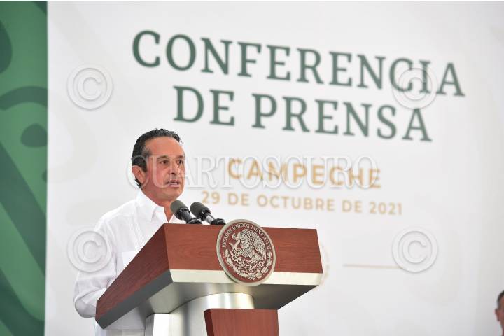 CAMPECHE, CAMPECHE, 29OCTUBRE2021.- Andrés Manuel López Obrador, Presidente de México, encabezó la conferencia mañanera en la Tercera Región Naval. Lo acompañaron Hugo López-Gatell, subsecretario de Salud; Rosa Icela Rodríguez, secretaria de Seguridad y Protección Ciudadana; Luis Cresencio Sandoval González, secretario de la Defensa Nacional; José Rafael Ojeda Durán, secretario de Marina; Layda Sansores, gobernadora de Campeche; Carlos Joaquín González, gobernador de Quintana Roo; Claudia Sheinbaum, Jefa de Gobierno; Adán Augusto López, secretario de Gobernación; y Jaime Bonilla, gobernador de Baja California. FOTO: PRESIDENCIA/CUARTOSCURO.COM