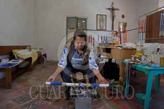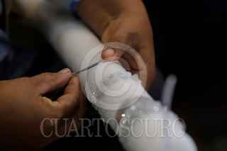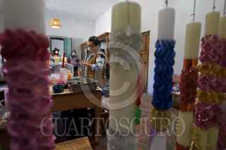 TOCHIMILCO, PUEBLA, 30OCTUBRE2021.- Artesanas del municipio de Tochimilco realizan ceras escamadas para la temporada de muertos. Las ceras escamadas son tradicionales de la región y se elaboran a partir de una vela común, la cual se moldea al calentarse para después ser coloreada con cintas y diamantina. Según la tradición, este tipo de cirios dan luz y guía a las almas durante las fiestas por Día de Muertos. FOTO: MIREYA NOVO/CUARTOSCURO.COM