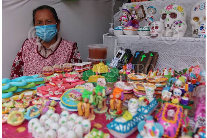 GUANAJUATO, GUANAJUATO, 31OCTUBRE2021.- El jardín Juárez cada año en temporada de día de muertos se llena de puestos de alfeñiques y charamuscas, dulces tipicos de Guanajuato con ingrediente principal de azúcar con el que hacen una masa y dan forma desde frutas hasta figurillas para el altar de muerto y figuras de personajes. Los dulceros artesanos han declarado que se encuentran contentos de que este año las ventas hayan incrementado por el regreso del Festival Internacional Cervantino. FOTO: ANDREA MURCIA /CUARTOSCURO.COM