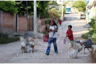 ATENANGO DEL RÍO, GUERRERO, 31OCTUBRE2021.- Un grupo de guajolotes silvestres camina por una calle del poblado de Temalac, al noreste del estado de Guerrero. Imagen tomada la tarde de ayer. FOTO: MARGARITO PÉREZ RETANA/CUARTOSCURO.COM