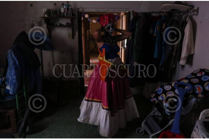 GUANAJUATO, GUANAJUATO, 01NOVIEMBRE2021.- Bianca es artista callejera en Guanajuato desde hace 4 años. En los personajes que realiza se encuentra una revolucionaria, mamá Imelda de Coco, una momia y su principal personaje: Frida Kahlo. Ella respeta su profesión y cree que el ser artista callejera no solo es ir a comprar un disfraz, ponértelo y salir a la calle a cobrar; es aprender del personaje, cuidar los detalles, incluso los desvelos para crear el vestuario de su personaje, sus accesorios, leer sobre ellos. Piensa qué hay muchas personas que no respetan a sus personajes y por eso las personas pierden credibilidad. Bianca tiene un bebé de un año que nació unos días antes de que llegara la pandemia al país, lo que provocó que dejara de salir a la calle y trabajar también le dio depresión, narra. Regreso a las calles este año y se reparte los cuidados del bebé con su esposo quien también se dedica a lo mismo y un día sale él y otro ella, cuando salen juntos lo cuida su madre. Bianca considera que sus personajes están hechos para las infancias, el cobro de la fotografía es voluntaria y no obligatoria porque entiende que a veces las madres hacen sacrificio por llevar a sus hijos a pasear y si no traen dinero no le gusta negarse. FOTO: ANDREA MURCIA /CUARTOSCURO.COM