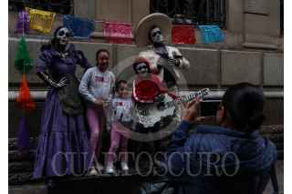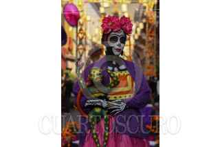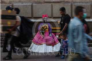 GUANAJUATO, GUANAJUATO, 01NOVIEMBRE2021.- Bianca es artista callejera en Guanajuato desde hace 4 años. En los personajes que realiza se encuentra una revolucionaria, mamá Imelda de Coco, una momia y su principal personaje: Frida Kahlo. Ella respeta su profesión y cree que el ser artista callejera no solo es ir a comprar un disfraz, ponértelo y salir a la calle a cobrar; es aprender del personaje, cuidar los detalles, incluso los desvelos para crear el vestuario de su personaje, sus accesorios, leer sobre ellos. Piensa qué hay muchas personas que no respetan a sus personajes y por eso las personas pierden credibilidad. Bianca tiene un bebé de un año que nació unos días antes de que llegara la pandemia al país, lo que provocó que dejara de salir a la calle y trabajar también le dio depresión, narra. Regreso a las calles este año y se reparte los cuidados del bebé con su esposo quien también se dedica a lo mismo y un día sale él y otro ella, cuando salen juntos lo cuida su madre. Bianca considera que sus personajes están hechos para las infancias, el cobro de la fotografía es voluntaria y no obligatoria porque entiende que a veces las madres hacen sacrificio por llevar a sus hijos a pasear y si no traen dinero no le gusta negarse. FOTO: ANDREA MURCIA /CUARTOSCURO.COM