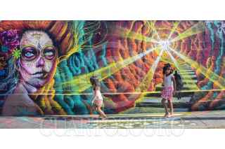 TAPACHULA, CHIAPAS, 01NOVIEMBRE2021.- Las bardas del Panteón Municipal lucen diversos murales alusivos al Día de Muertos. En la imagen un par de niñas se entremezclan con la narrativa visual de uno de estos murales. FOTO: DAMIÁN SÁNCHEZ/CUARTOSCURO.COM