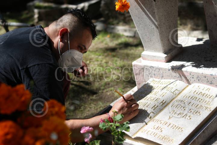 CIUDAD DE MÉXICO, 02NOVIEMBRE2021.- Decenas de familias acudieron desde temprana hora al panteón Xico ubicado en Coyoacán, para limpiar y poner flores en las tumbas de sus seres queridos fallecidos. FOTO: ANDREA MURCIA /CUARTOSCURO.COM
