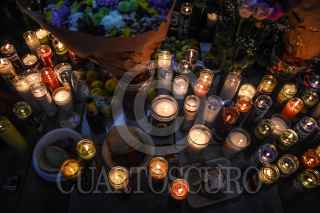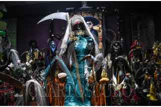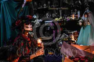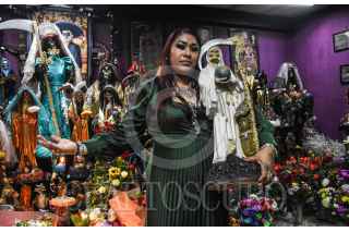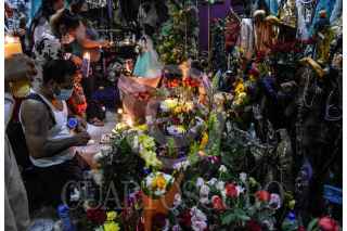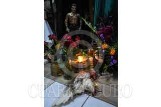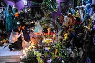 CANCÚN, QUINTANA ROO, 02NOVIEMBRE2021.- Flores, veladoras, comida, tequila, mariachi y pelea de gallos, así se vivió la fiesta para la "Niña Blanca" en el templo y recinto de sanación "Mí dulce madre mística eterna esperanza por siempre", ubicado en una colonia popular de Cancún. Más de 10,000 imágenes de la Santa Muerte adornan el recinto fundado hace 14 años por la chamana Yuri Mendez quien hoy recibió a los fieles en su casa. FOTO: ELIZABETH RUIZ/CUARTOSCURO.COM
