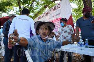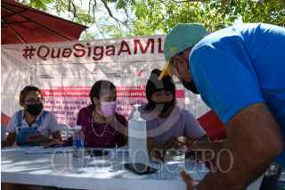 CAMPECHE, CAMPECHE, 03NOVIEMBRE2021.- Militantes y simpatizantes de Morena instalaron un módulo en el parque de Alameda para recopilar firmas ciudadanas para buscar la ratificación de mandato del Presidente Andrés Manuel López Obrador. La recolección de firmas durara 45 días, se requiere 2.8 millones de firmas para la votación; Campeche requiere enviar el tres por ciento de la lista nominal, alrededor de 19 mil firmas, este ejercicio se estaría realizando el 27 de marzo. FOTO: MICHAEL BALAM/CUARTOSCURO.COM