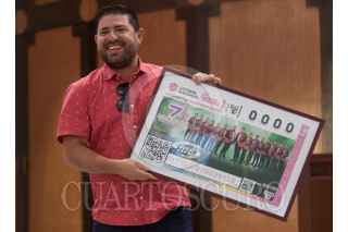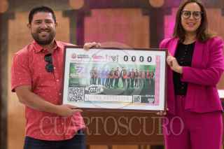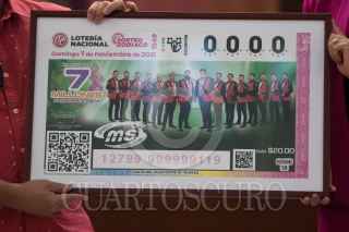 CIUDAD DE MÉXICO. 03NOVIEMBRE2021.- Sofía Lara Salazar, de la Lotería Nacional junto con Sergio Lizárraga, lider de la Banda MS, en la develación del Billete de Lotería que tiene la imagen de la agrupación grupera presentado este, medio día en el edificio El Moro de la Lotenal. FOTO: VICTORIA VALTIERRA/CUARTOSCURO.COM