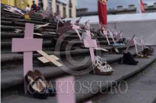 XALAPA, VERACRUZ, 04NOVIEMBRE2021.- Por tercer año consecutivo activistas colocaron cruces y zapatos de mujer en las escalinatas de la Catedral Metropolitana como un reclamo a las autoridades, pues pese a las peticiones no se ha logrado que el gobierno de Veracruz emita la tercera alerta por violencia de género. FOTO: YERANIA ROLÓN/CUARTOSCURO.COM