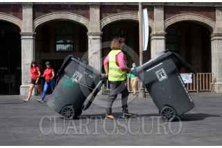 CUERNAVACA, MORELOS, 05NOVIEMBRE2021.-Una trabajadora de limpia inicia su día llevando dos grandes botes de basura a su sitio en la plaza de armas de la capital. . FOTO: MARGARITO PÉREZ RETANA/CUARTOSCURO.COM