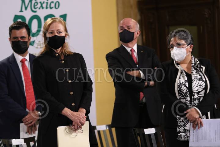 CIUDAD DE MÉXICO, 08NOVIEMBRE2021.- Andrés Manuel López Obrador, Presidente de México, encabezó la mañanera en Palacio Nacional, en donde presentó el ¿Quién es quién?, en los precios de las gasolinas y gas LP, dieron detalles del Buen Fin, y presentaron los videos de los avances de la obras, como el Aeropuerto Internacional Felipe Ángeles. Acompañaron al mandatario: Tatiana Clouthier Carrillo, secretaria de Economía; Raquel Buenrostro Sánchez, titular de Servicio de Administración Tributaria (SAT); Ricardo Sheffield Padilla, procurador Federal del Consumidor; José Héctor Tejada Sharp, presidente la Confederación de Cámaras Nacionales de Comercio (CONCANACO); Vicente Yáñez Solloa, presidente la Asociación Nacional de Tiendas de Autoservicio y Departamentales (ANTAD), y Jesús Cantú Escalante, titular de la Unidad de Normatividad, Competitividad y Competencia. FOTO: MOISÉS PABLO/CUARTOSCURO.COM