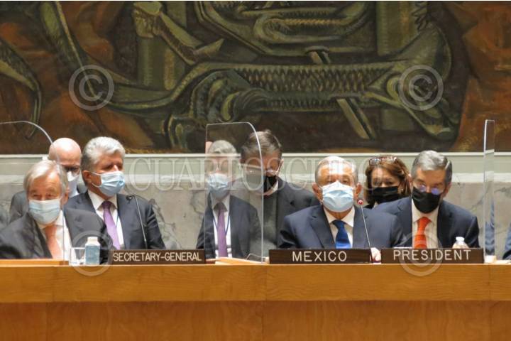 NUEVA YORK, ESTADOS UNIDOS, 09NOVIEMBRE2021.- Andrés Manuel López Obrador, Presidente de México, ofreció un discurso ante el Consejo de Seguridad de la ONU, ahí propuso un "Plan Mundial de Fraternidad y Bienestar". Lo acompañaron el canciller Marcelo Ebrard Casaubon, y Juan Ramón de la Fuente, representante permanente de México ante la Organización de las Naciones Unidas. FOTO: PRESIDENCIA/CUARTOSCURO.COM