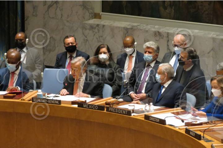 NUEVA YORK, ESTADOS UNIDOS, 09NOVIEMBRE2021.- Andrés Manuel López Obrador, Presidente de México, ofreció un discurso ante el Consejo de Seguridad de la ONU, ahí propuso un "Plan Mundial de Fraternidad y Bienestar". Lo acompañaron el canciller Marcelo Ebrard Casaubon, y Juan Ramón de la Fuente, representante permanente de México ante la Organización de las Naciones Unidas. FOTO: PRESIDENCIA/CUARTOSCURO.COM