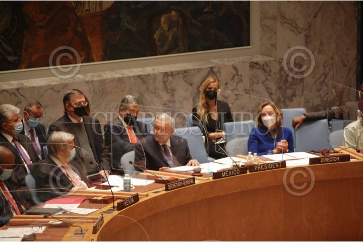 NUEVA YORK, ESTADOS UNIDOS, 09NOVIEMBRE2021.- Andrés Manuel López Obrador, Presidente de México, ofreció un discurso ante el Consejo de Seguridad de la ONU, ahí propuso un "Plan Mundial de Fraternidad y Bienestar". Lo acompañaron el canciller Marcelo Ebrard Casaubon, y Juan Ramón de la Fuente, representante permanente de México ante la Organización de las Naciones Unidas. FOTO: PRESIDENCIA/CUARTOSCURO.COM