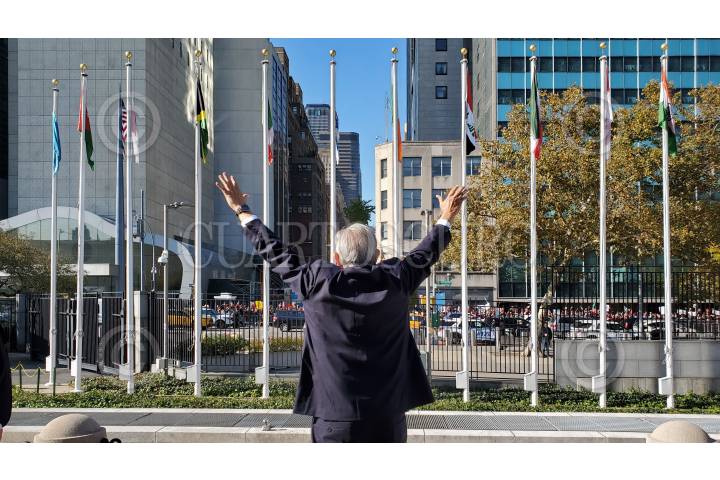 NUEVA YORK, ESTADOS UNIDOS, 09NOVIEMBRE2021.- Andrés Manuel López Obrador, Presidente de México, ofreció un discurso ante el Consejo de Seguridad de la ONU, ahí propuso un "Plan Mundial de Fraternidad y Bienestar". Lo acompañaron el canciller Marcelo Ebrard Casaubon, y Juan Ramón de la Fuente, representante permanente de México ante la Organización de las Naciones Unidas. FOTO: PRESIDENCIA/CUARTOSCURO.COM