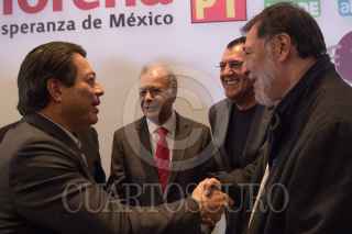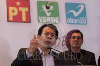 CIUDAD DE MÉXICO, 09NOVIEMBRE2021.- Mario Delgado, dirigente nacional del Morena; Sonia Rincón, dirigente nacional de Nueva Alianza; Alberto Anaya, dirigente del PT, y Karen Castrejón, dirigente del PVEM, anunciaron una alianza para competir por las seis gubernaturas en las elecciones del próximo año. FOTO: MOISÉS PABLO/CUARTOSCURO.COM