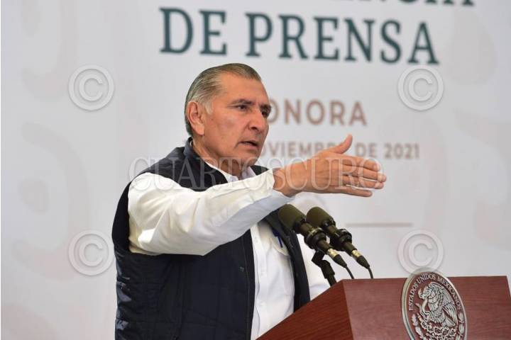 HERMOSILLO, SONORA, 12NOVIEMBRE2021.- Andrés Manuel López Obrador, Presidente de México, encabezó la mañanera en la Base Aérea Militar No. 18, ubicada en la colonia La Manga. Lo acompañaron Alfonso Durazo, gobernador de Sonora; Adán Augusto López, secretario de Gobernación; Luis Cresencio Sandocal, secretario de la Defensa Nacional; Rosa Icela Rodríguez, secretaria de Seguridad y Participación de Pública; José Rafael Ojeda Durán, secretario de la Marina, y Luis Rodríguez, comandante general de la Guardia Nacional. FOTO: PRESIDENCIA/CUARTOSCURO.COM