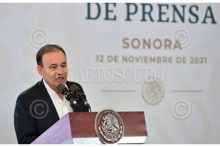 HERMOSILLO, SONORA, 12NOVIEMBRE2021.- Andrés Manuel López Obrador, Presidente de México, encabezó la mañanera en la Base Aérea Militar No. 18, ubicada en la colonia La Manga. Lo acompañaron Alfonso Durazo, gobernador de Sonora; Adán Augusto López, secretario de Gobernación; Luis Cresencio Sandocal, secretario de la Defensa Nacional; Rosa Icela Rodríguez, secretaria de Seguridad y Participación de Pública; José Rafael Ojeda Durán, secretario de la Marina, y Luis Rodríguez, comandante general de la Guardia Nacional. FOTO: PRESIDENCIA/CUARTOSCURO.COM