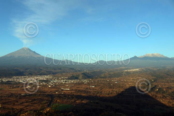 SAN NICOLAS DE LOS RANCHOS, PUEBLA, 13NOVIEMBRE2021. Según el ultimo reporte del Centro Nacional de Prevención de Desastres, sobre la actividad del volcán Popocatépetl, este ha tenido en las ultimas 24 horas, trece exhalaciones, algunas acompañadas de vapor de agua y gases. Imagen tomada desde el cerro Teoton a 2700 msnm. Los habitantes de este municipio aseguran que el cerro Teoton (Ídolo) alberga una pirámide parecida a la de Cholula. FOTO: MARGARITO PÉREZ RETANA/CUARTOSCURO.COM