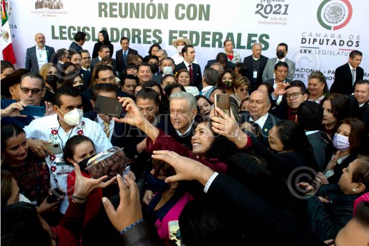 CIUDAD DE MÉXICO, 16NOVIEMBRE2021.- Andrés Manuel López Obrador, Presidente Constitucional de los Estados Unidos Mexicanos, se reunió con diputados federales del PT, PVEM, Morena y Nueva Alianza, quienes aprobaron el Presupuesto de Egresos de la Federación 2022 (PEF 2022), en el Patio Central de Palacio nacional. En el evento también estuvieron presentes Victoria Rodríguez Ceja, Subsecretaria de Egresos de la; Rogelio Ramírez de la O, Secretario de Hacienda y Crédito Público; Adán Augusto López Hernández, Secretario de Gobernación; Ignacio Mier, coordinador de Morena en la Cámara de Diputados; Alberto Anaya Gutiérrez, coordinador del PT en la Cámara de Diputados, y Carlos Puente Salas, coordinador del PVEM, en la Cámara de Diputados. FOTO: PRESIDENCIA/CUARTOSCURO.COM