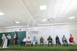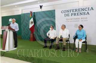 BENITO JUÁREZ, QUINTANA ROO, 17NOVIEMBRE2021.- Andrés Manuel López Obrador, presidente de México, en conferencia de prensa matutina acompañado de Carlos Joaquín González, Gobernador de Quintana Roo; Adán Augusto López Hernández, Secretario de Gobernación; Rosa Icela Rodríguez Velázquez, secretaria de Seguridad y Protección Ciudadana; José Rafael Ojeda Durán, secretario de Marina; Luis Cresencio Sandoval González, secretario de la Defensa Nacional; Ana Elizabeth García Vilchis; Luis Rodríguez Bucio, comandante de la Guardia Nacional y Mara Lezama Espinosa, Presidenta Municipal de Benito Juárez, Quintana Roo. FOTO: PRESIDENCIA /CUARTOSCURO.COM