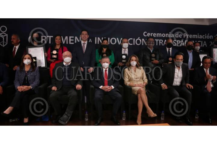 CIUDAD DE MÉXICO, 17NOVIEMBRE2021.- Arturo Zaldívar Lelo de Larrea, Ministro presidente de la Suprema Corte de Justicia de la Nación; Blanca Lilia Ibarra Cadena, comisionada presidenta del INAI; Diego Sinhue Rodríguez Vallejo, Gobernador del estado de Guanajuato; Norma Julieta del Río Venegas, comisionada del INAI; David Rogelio Colmenares Páramo, titular de la Auditoría Superior de la Federación (ASF); Luis Miguel Martínez Anzures, presidente del Consejo Directivo del Instituto Nacional de Administración Pública; y Oscar Mauricio Guerra Ford, comisionado del INAI, durante la ceremonia a la innovación en transparencia 2021 del INAI. FOTO: ANDREA MURCIA /CUARTOSCURO.COM