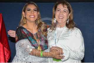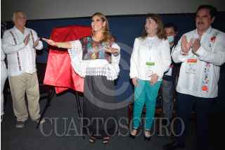 MÉRIDA, YUCATÁN, 18NOVIEMBRE2021.- Evelyn Salgado, gobernadora de Guerrero, y Miguel Torruco, secretario de Turismo, y Margarita González Sarabia, directora general de Lotería Nacional, encabezaron la develación del billete conmemorativo de la edición 45 del Tianguis Turístico México. FOTO: MARIO JASSO/CUARTOSCURO.COM