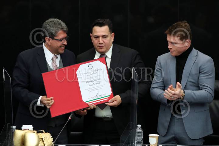 CIUDAD DE MÉXICO, 18NOVIEMBRE2021.- Eddy Reynoso, entrenador de Saúl "Canelo" Álvarez, recibió un reconocimiento en el Senado de la República, el cual estuvo encabezado por Ricardo Monreal Ávila, Presidente de la Jucopo. El llamado Canelo Álvarez asistió como invitado y ahí convivió con los senadores presentes. FOTO: CUARTOSCURO.COM