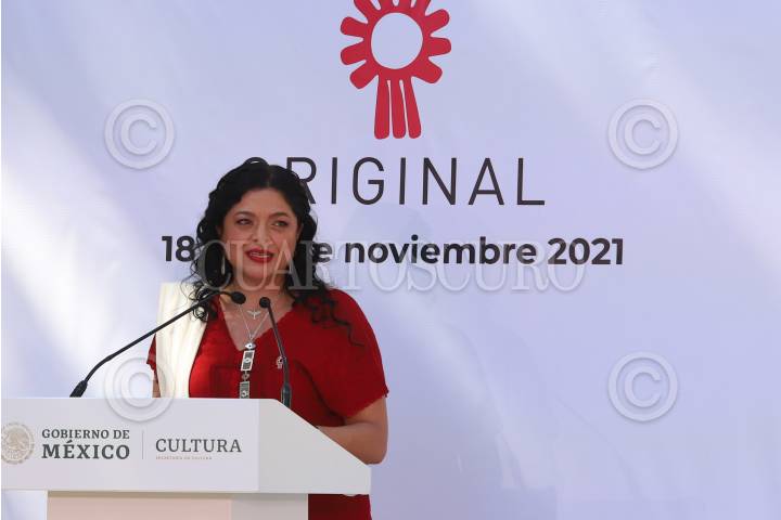 CIUDAD DE MÉXICO, 18NOVIEMBRE2021.- Delfina Gómez, secretaria de Educación Pública (SEP); Aurelia Gómez Jiménez, maestra artesana; Alejandra Frausto, secretaria de Cultura; Héctor Tamayo, maestro artesano, y Susana Harp, senadora de Morena, durante la inauguración "Original, Encuentro de Arte Textil Mexicano", en el Complejo Cultural Los Pinos. FOTO: EDGAR NEGRETE/CUARTOSCURO.COM