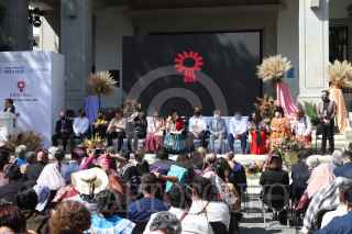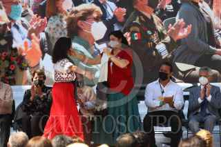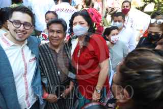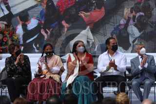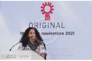 CIUDAD DE MÉXICO, 18NOVIEMBRE2021.- Delfina Gómez, secretaria de Educación Pública (SEP); Aurelia Gómez Jiménez, maestra artesana; Alejandra Frausto, secretaria de Cultura; Héctor Tamayo, maestro artesano, y Susana Harp, senadora de Morena, durante la inauguración "Original, Encuentro de Arte Textil Mexicano", en el Complejo Cultural Los Pinos. FOTO: EDGAR NEGRETE/CUARTOSCURO.COM