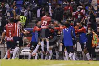PUEBLA, PUEBLA, 20NOVIEMBRE2021.- En partido de repechaje entre Club Puebla y las Chivas de Guadalajara empataron 2-2, por lo que tuvieron que irse a penales, en donde los poblanos se impusieron 6-5, para poder asi acceder a la liguilla del torneo Grita México Apertura 2021 de la Liga BBVA MX, encuentro celebrado en el estadio Cuauhtémoc. FOTO: MIREYA NOVO/CUARTOSCURO.COM