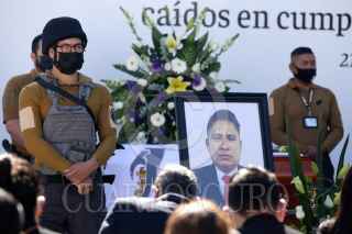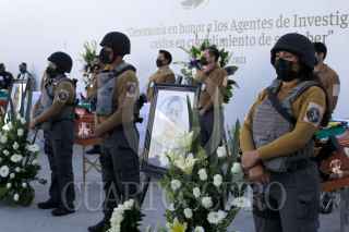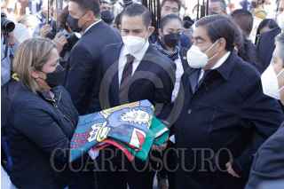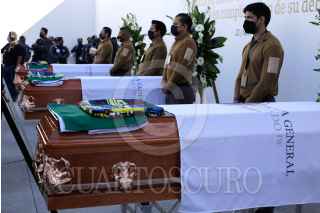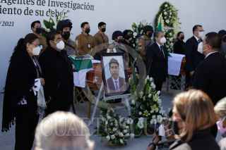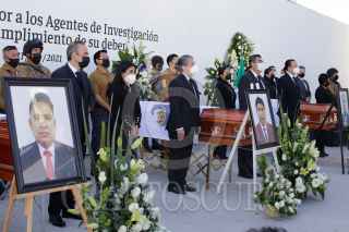 PUEBLA, PUEBLA, 21NOVIEMBRE2021.- Familiares, amigos y autoridades como el gobernador de Puebla, MiguelBarbosa, y el fiscal de Puebla, Gilberto Higuera Bernal, rindieron un homenaje de cuerpo presente a los tres agentes ministeriales supuestamente asesinados por policías municipales de Tecamachalco. La ceremonia en honor a los tres ministeriales; Adrián, Miguel y Guillermo, se realizó en las instalaciones de la Unidad de Análisis de Información de la Fiscalía General de Puebla, ahí el gobernador se comprometió a castigar a los responsables. Ayer sábado la Fiscalía dio a conocer que el secretario de Seguridad de Tecamachalco, Alejandro Santino, fue detenido junto a 12 policías y su escolta, acusados de haber participado en el asesinato de los tres elementos de la Policía Ministerial. FOTO: CUARTOSCURO.COM