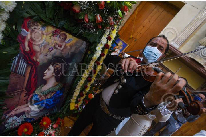 CALIMAYA, ESTADO DE MÉXICO, 22NOVIEMBRE2021.- En el Día de los Músicos, mariachis de Calimaya celebraron a su santa patrona, Santa Cecilia, con imágenes y música escucharon misa en la iglesia de San Pedro y San Pablo en la cabecera municipal, interpretando varias piezas musicales y pidiendo por un buen año de trabajo, siendo unos de los sectores que se vio más afectado por la pandemia por COVID-19 al cancelarse todo tipo de eventos. FOTO: CRISANTA ESPINOSA AGUILAR /CUARTOSCURO.COM