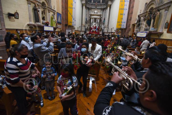 CALIMAYA, ESTADO DE MÉXICO, 22NOVIEMBRE2021.- En el Día de los Músicos, mariachis de Calimaya celebraron a su santa patrona, Santa Cecilia, con imágenes y música escucharon misa en la iglesia de San Pedro y San Pablo en la cabecera municipal, interpretando varias piezas musicales y pidiendo por un buen año de trabajo, siendo unos de los sectores que se vio más afectado por la pandemia por COVID-19 al cancelarse todo tipo de eventos. FOTO: CRISANTA ESPINOSA AGUILAR /CUARTOSCURO.COM
