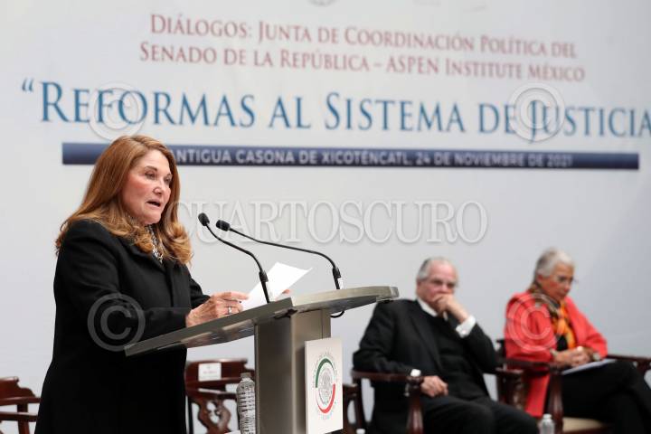 CIUDAD DE MÉXICO, 24NOVIEMBRE2021.- Ricardo Monreal Ávila, presidente de la Junta de Coordinación Política, y Olga Sánchez Cordero, presidenta de la mesa directiva del Senado, durante el foro "Reforma al Sistema de Justicia", en la Casona de Xicoténcatl. Entre los ponentes estuvieron Máximo Carvajal Contreras, Macarita Elizondo Gasperín, Luis Rodríguez Manzanera, y Mireille Roccatti Valázquez, FOTO: SENADO DE LA REPÚBLICA/CUARTOSCURO.COM