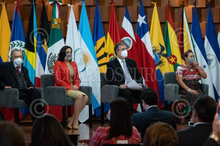 CIUDAD DE MÉXICO, 25NOVIEMBRE2021.- Marcelo Ebrard, secretario de Relaciones Exteriores, encabezó la inauguración del conversatorio con galardonados del Premio Nobel en América Latina en la Secretaría de Relaciones Exteriores (SRE). El evento contó con la presencia de: Laura Sprechman, CEO de la Fundación Nobel Prize Outreach; Rigoberta Menchú, premio Nobel de la Paz en 1992; David Kershenobich, premio Nobel de Medicina 2020; Gautier Mignot, titular de la Delegación de la Unión Europea en México y Premio Nobel de la Paz en 2012, por mencionar algunos. FOTO: GALO CAÑAS/CUARTOSCURO.COM
