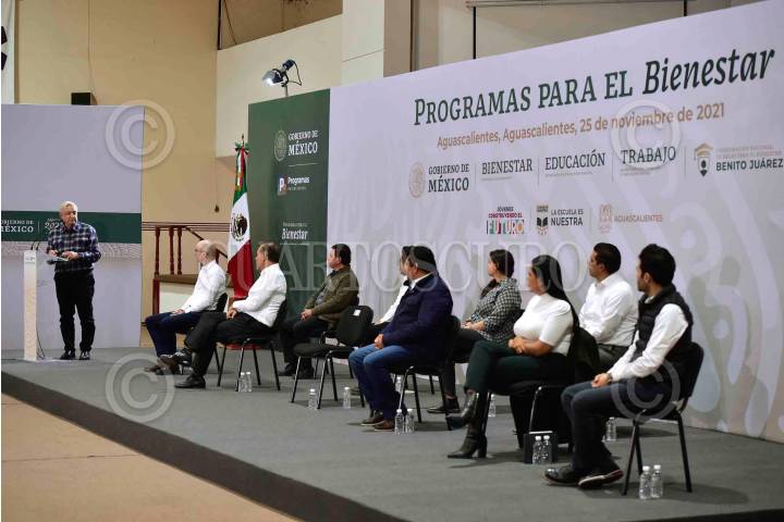 AGUASCALIENTES, AGUASCALIENTES, 25NOVIEMBRE2021.- Andrés Manuel López Obrador, Presidente de México, presidió los Programas para el Bienestar en el Instituto Tecnológico de Aguascalientes. Acompañaron al mandatario: Martín Orozco Sandoval, Gobernador Constitucional del Estado de Aguascalientes; Javier May Rodríguez, Secretario de Bienestar; Ariadna Montiel Reyes, Subsecretaria de Bienestar; Marath Baruch Bolaños López, Subsecretario de Empleo y Productividad Laboral de la Secretaría del Trabajo y Previsión Social; Carlos Torres Rosas, Coordinador General de Programas Integrales para el Bienestar; Jesús Ramírez Cuevas, Coordinador General de Comunicación Social y Vocero de la Presidencia de la República; Abraham Vázquez Piceno, Coordinador Nacional del Programa de Becas para el Bienestar “Benito Juárez”; Pamela López Ruiz, Directora General del Programa “La Escuela es Nuestra” y Leonardo Montañez Castro, Presidente Municipal de Aguascalientes. FOTO: PRESIDENCIA/CUARTOSCURO.COM