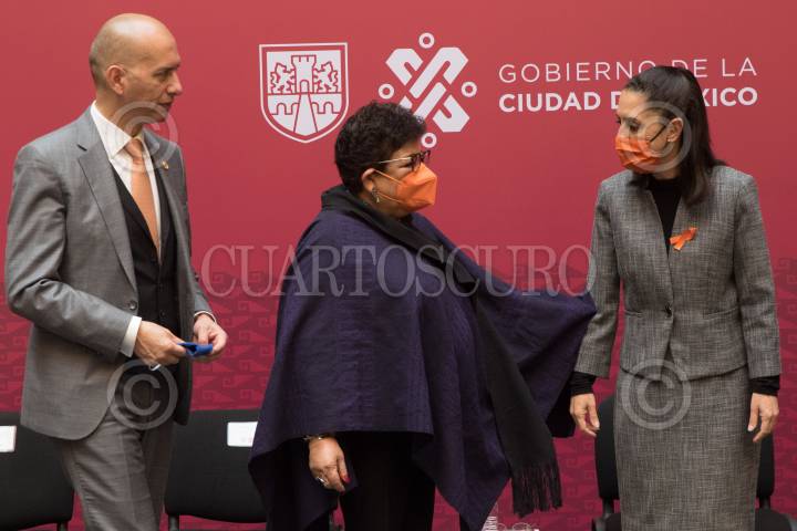 CIUDAD DE MÉXICO, 25NOVIEMBRE2021.- Claudia Sheinbaum, Jefa de Gobierno; Ernestina Godoy, Fiscal General de Justicia de la Ciudad de México; Salvador Guerrero Chiprés, presidente del Consejo Ciudadano para la Seguridad y Justicia de la Ciudad de México; Ingrid Gómez Saracíbar, titular de la Secretaría de las Mujeres; Laura Martínez Rodríguez, directora de la Asociación para el Desarrollo Integral de Personas Violadas A.C. (ADIVAC), y Mauro Antonio Vargas Urías, director general de Gendes, A.C., durante la presentación de la campaña contra la violencia sexual, "La Responsabilidad es Nuestra", realizada en el Palacio de la Autonomía de la UNAM. FOTO: MOISÉS PABLO/CUARTOSCURO.COM