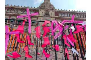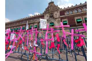 CIUDAD DE MÉXICO, 25NOVIEMBRE2021.- En el marco del Día Internacional de la Eliminación de la Violencia contra la Mujer activistas colocaron cruces rosas en las vallas que resguardan el Palacio Nacional. FOTO: MOISÉS PABLO/CUARTOSCURO.COM