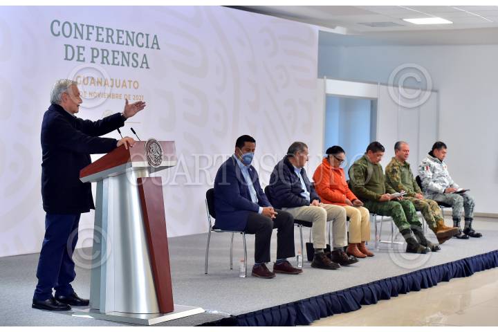 IRAPUATO, GUANAJUATO, 26NOVIEMBRE2021.- Andrés Manuel López Obrador, Presidente de México, encabezó la conferencia de prensa que se realizó en la 7 Región Militar. Acompañaron al mandatario: Diego Sinhue Rodríguez Vallejo, gobernador de Guanajuato; Adán Augusto López Hernández, secretario de Gobernación; Luis Cresencio Sandoval González, secretario de la Defensa Nacional; Rosa Icela Rodríguez Velázquez, secretaria de Seguridad y Protección Ciudadana; José Raúl Ojeda Durán, secretario de Marina y Luis Rodríguez Bucio, comandante de la Guardia Nacional. FOTO: PRESIDENCIA/CUARTOSCURO.COM