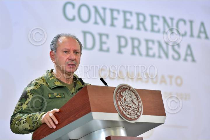 IRAPUATO, GUANAJUATO, 26NOVIEMBRE2021.- Andrés Manuel López Obrador, Presidente de México, encabezó la conferencia de prensa que se realizó en la 7 Región Militar. Acompañaron al mandatario: Diego Sinhue Rodríguez Vallejo, gobernador de Guanajuato; Adán Augusto López Hernández, secretario de Gobernación; Luis Cresencio Sandoval González, secretario de la Defensa Nacional; Rosa Icela Rodríguez Velázquez, secretaria de Seguridad y Protección Ciudadana; José Raúl Ojeda Durán, secretario de Marina y Luis Rodríguez Bucio, comandante de la Guardia Nacional. FOTO: PRESIDENCIA/CUARTOSCURO.COM