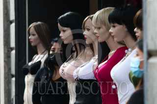 CIUDAD DE MÉXICO, 27NOVIEMBRE2021.- Vendedoras se asoman entre maniquíes de mujeres en una tienda del Centro Histórico. FOTO: GRACIELA LÓPEZ /CUARTOSCURO.COM