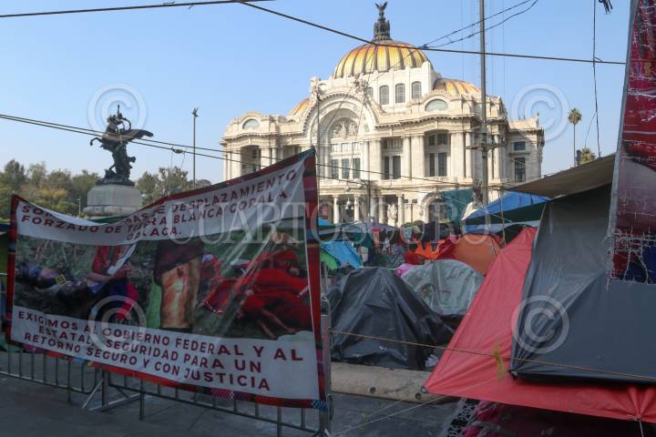 CIUDAD DE MÉXICO, 27NOVIEMBRE2021.- Desplazados triquis de Tierra Blanca, Oaxaca, mantienen un plantón desde el 26 de diciembre del 2020 después de que paralimitares armados con armas de fuego los despojaron de su comunidad. El 27 de julio del presente año, según versiones del Estado Mexicano, ya existían condiciones para un retorno seguro pero al tratar de ingresar a su pueblo el continente fue frenado nuevamente por paramilitares y nuevamente regresaron a mantener el plantón en Eje Central, enfrente de Palacio de Bellas Artes. La comunidad triquis exige un retorno seguro a Tierr Blanca, Oaxaca. FOTO: GRACIELA LÓPEZ /CUARTOSCURO.COM