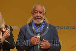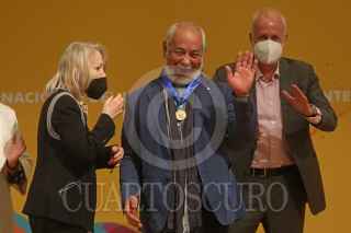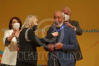 GUADALAJARA, JALISCO, 28NOVIEMBRE2021.- Leonardo Padura escritor cubano recibió de manos de Silvia Lemus la medalla Carlos Fuentes y presento su libro “Como Polvo en el Viento”, esto durante la edición 35 de la Feria Internacional del Libro de Guadalajara (FIL), que se lleva a cabo en Expo y en donde Perú es el país invitado de honor. FERNANDO CARRANZA GARCIA / CUARTOSCURO.COM