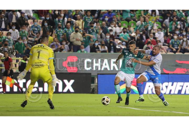 LEÓN, GUANAJUATO, 28NOVIEMBRE2021.- El León se enfrenta al Puebla en el partido de vuelta de los cautos de final de la Liga MX, en el estadio León. En equipo poblano viene con una ventaja luego de que en el primer juego se impusieran 2-1. Los locales se impusieron 2-0 autoría de sus delantero Ángel Mena. Con esto los esmeraldas pasan a las semifinales, ya que el marcador global quedó 3-2. FOTO: JORGE ORTEGA/CUARTOSCURO.COM